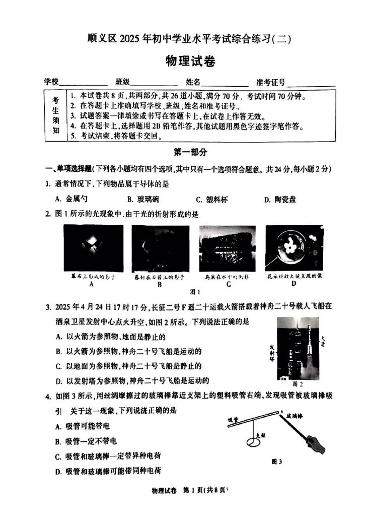 2025北京各区初三二模已陆续开始,北达教研组整理了北京顺义区2025初三二模物理试题及答案,分享给大家。