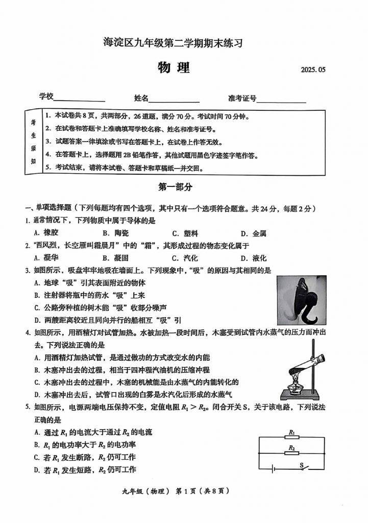 首页 初三试题 2025北京海淀区初三二模物理试题及答案
