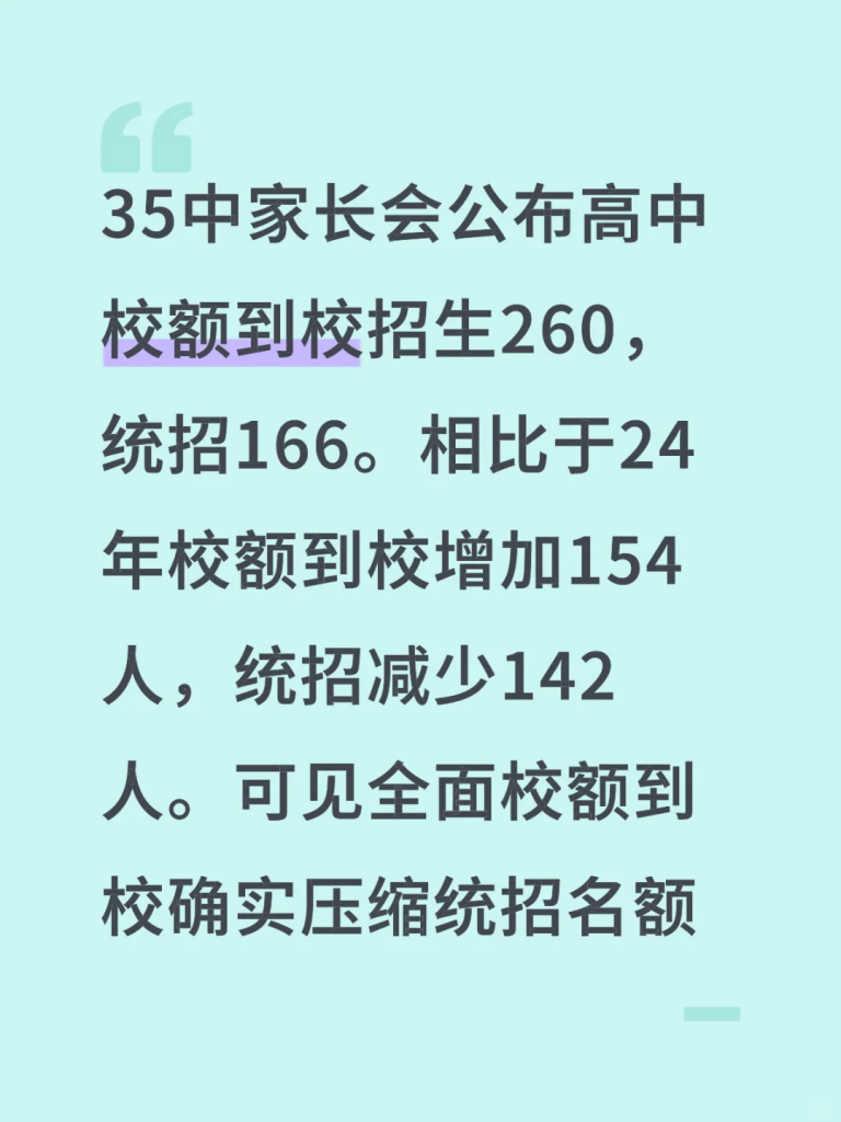 35中家长会公布高中校额到校招生260,统招166。相比于24年校额到校增加154人,统招减少142人。可见全面校额到校确实压缩统招名额。