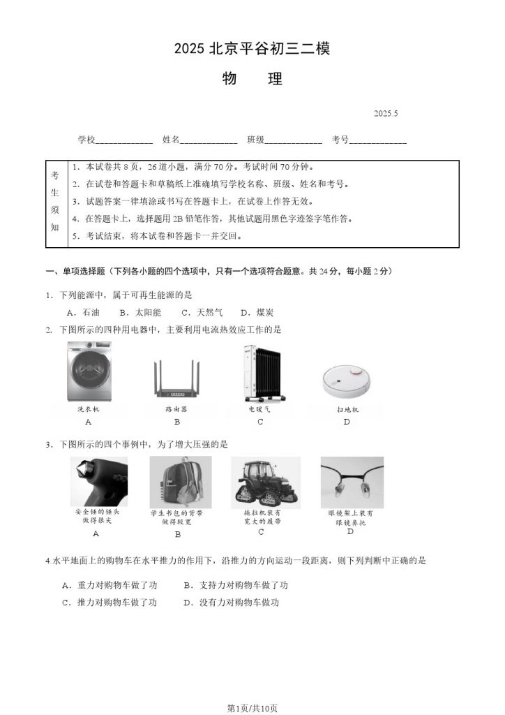 2025北京各区初三二模已陆续开始,北达教研组整理了2025北京平谷区初三二模物理试题及答案,分享给大家。