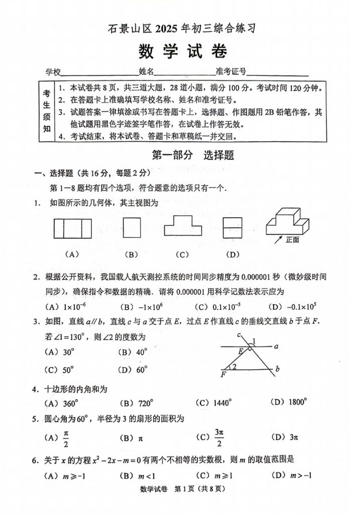 2025北京各区初三二模已陆续开始,北达教研组整理了2025北京石景山区初三二模数学试题,分享给大家。