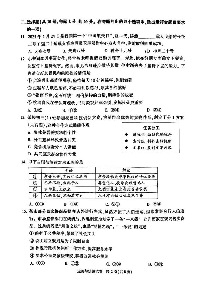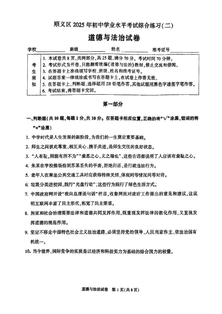 2025北京各区初三二模已陆续开始,北达教研组整理了2025北京顺义区初三二模道法试题,分享给大家。