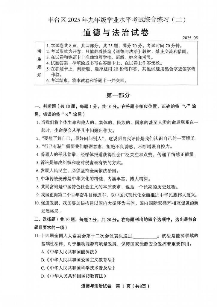 2025北京各区初三二模已陆续开始,北达教研组整理了北京丰台区2025初三二模道法试题及答案,分享给大家。