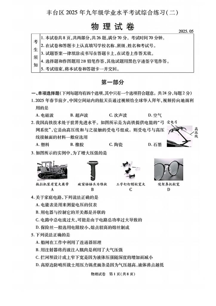 2025北京各区初三二模已陆续开始,北达教研组整理了2025北京丰台区初三二模物理试题及答案,分享给大家。