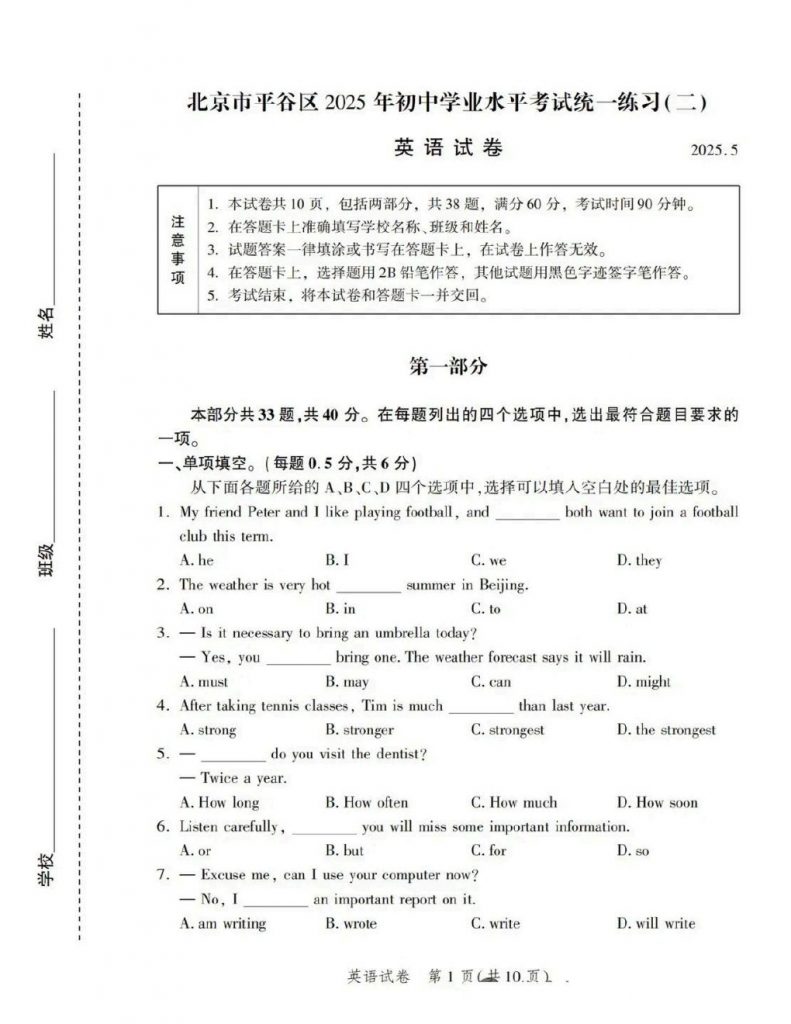 2025北京各区初三二模已陆续开始,北达教研组整理了北京平谷2025初三二模英语试题及答案,分享给大家。