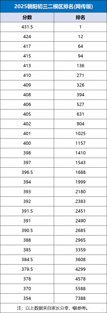 2025北京朝阳区初三二模区排名出炉!400分+1157人!有部分家长通过交流分享老师给到的成绩,自行整理出一版区排名。以下数据,仅供参考。