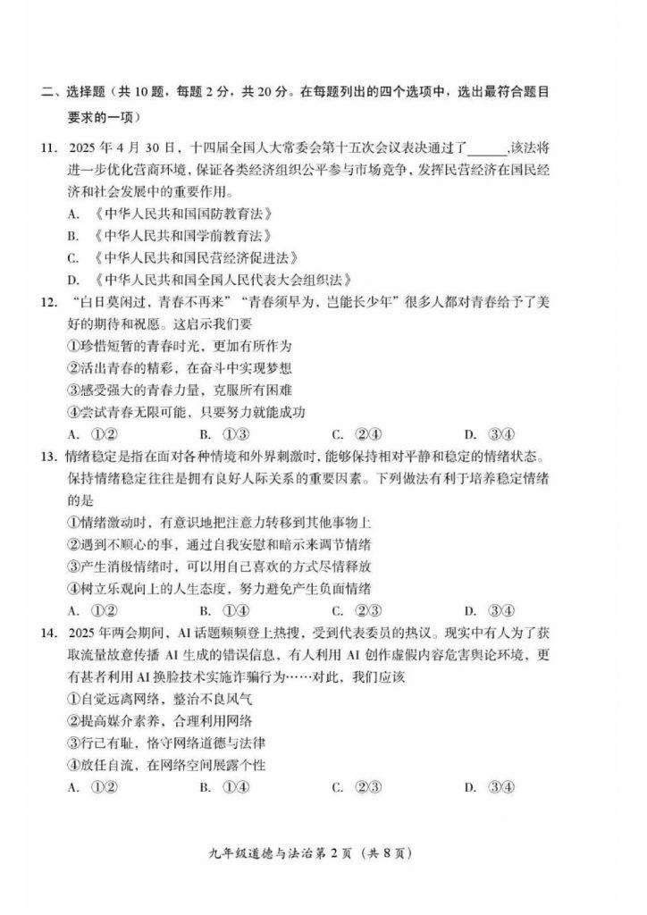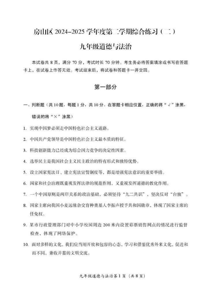 2025北京各区初三二模已陆续开始,北达教研组整理了北京房山2025初三二模道法试题及答案,分享给大家。