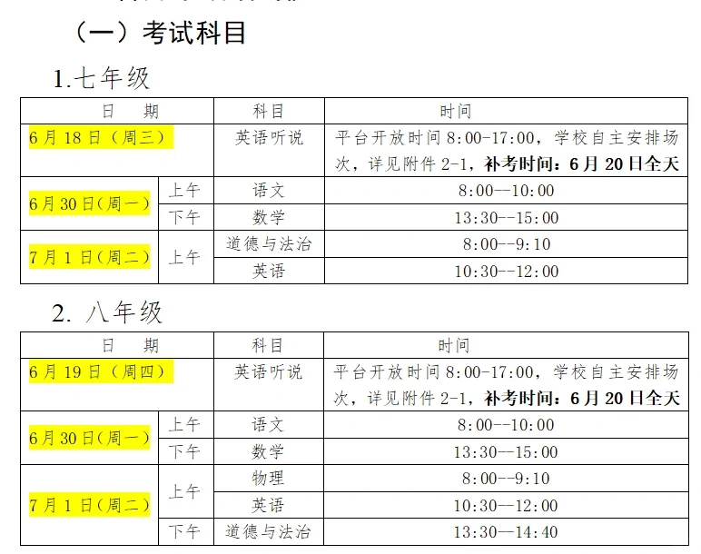 北京八十中2025初中下学期期末考试安排