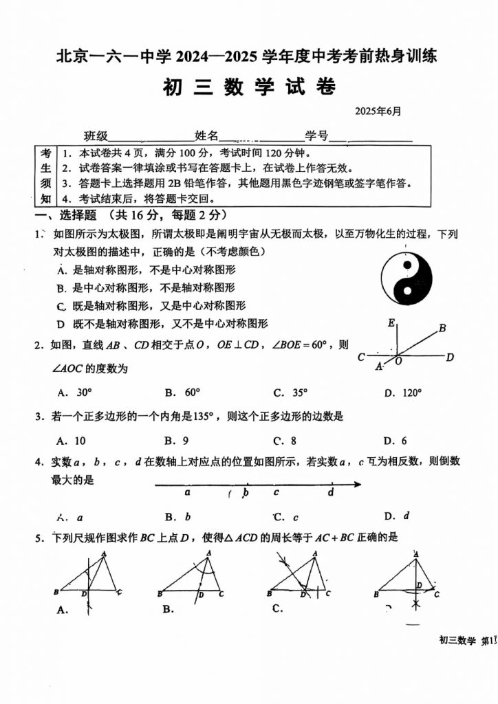 2025北京北达教育竞技俱乐部即将来临,北达教研组整理了2025北京一六一中初三三模数学试题,分享给大家: