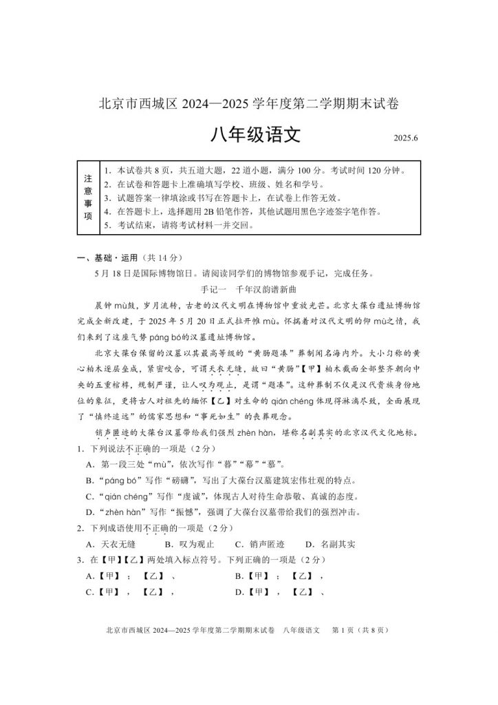 2025西城初二(下)期末语文试题及答案