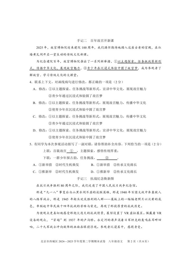 首页 初二试题 2025西城初二(下)期末语文试题及答案