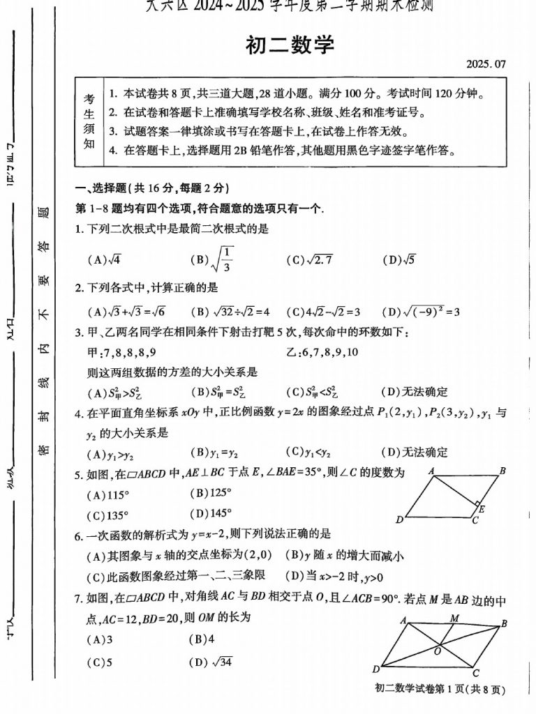 2025年北京各区初二(下)期末考已陆续开始进行,北达教研组整理了202北京大兴初二(下)期末数学试题,分享给大家。