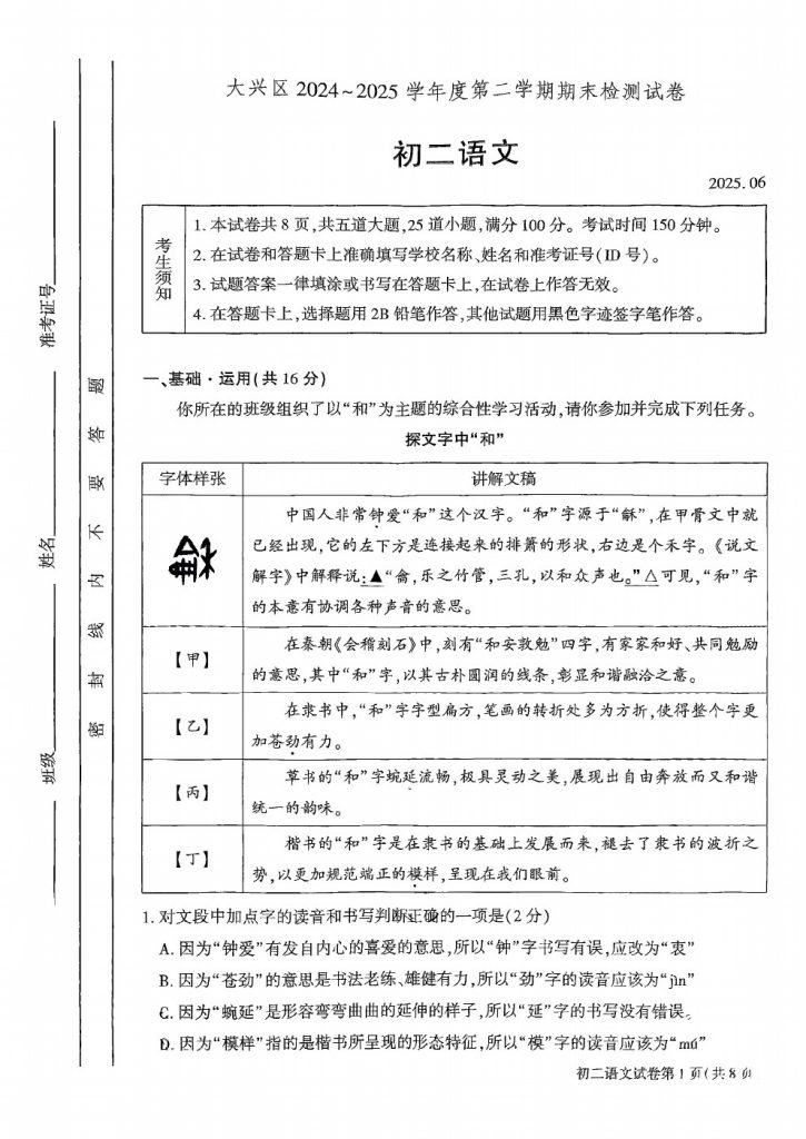2025年北京各区初二(下)期末考已陆续开始进行,北达教研组整理了2025大兴初二(下)期末语文试题及答案,分享给大家。
