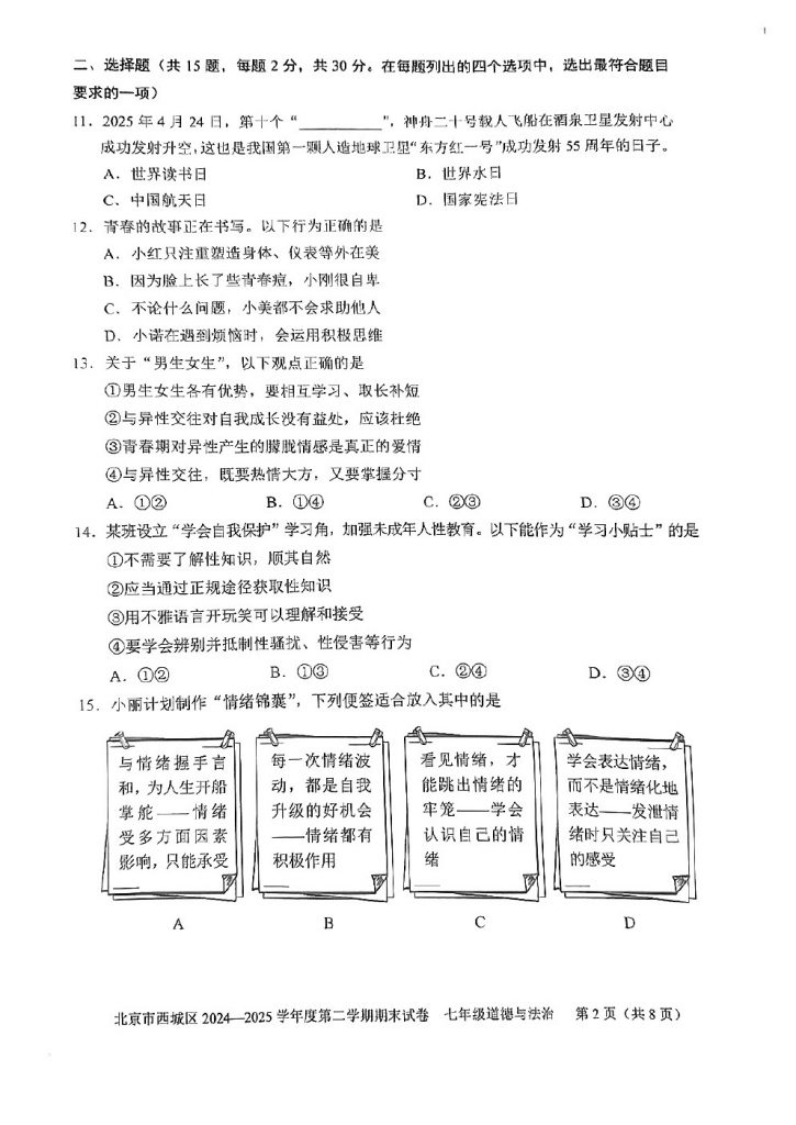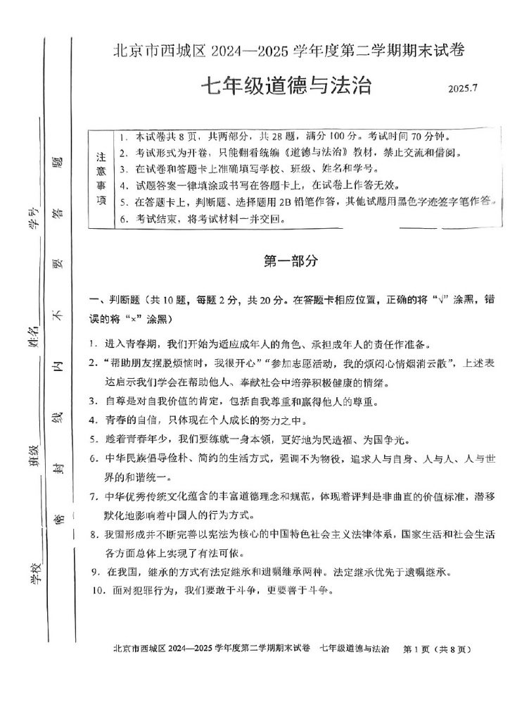 2025年北京各区初二(下)期末考已陆续开始进行,北达教研组整理了2025北京西城区初一(下)期末道法试题,分享给大家。