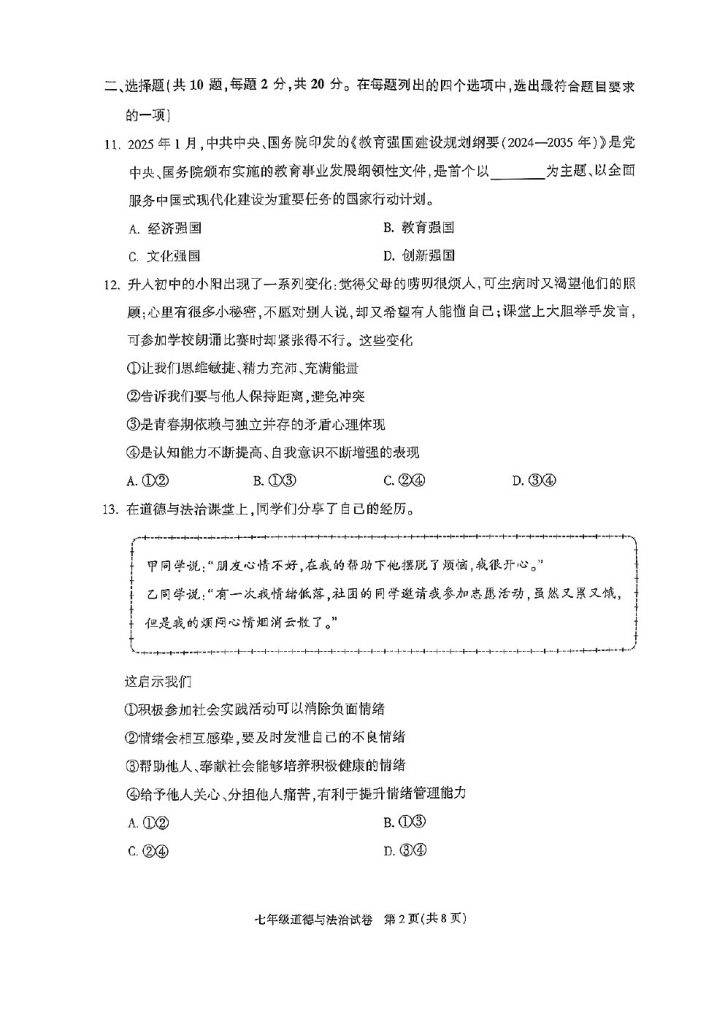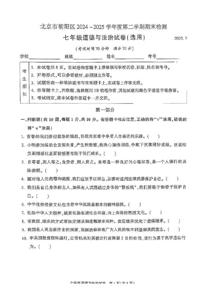 2025年北京各区初二(下)期末考已陆续开始进行,北达教研组整理了2025朝阳初一(下)期末道法试题及答案,分享给大家。