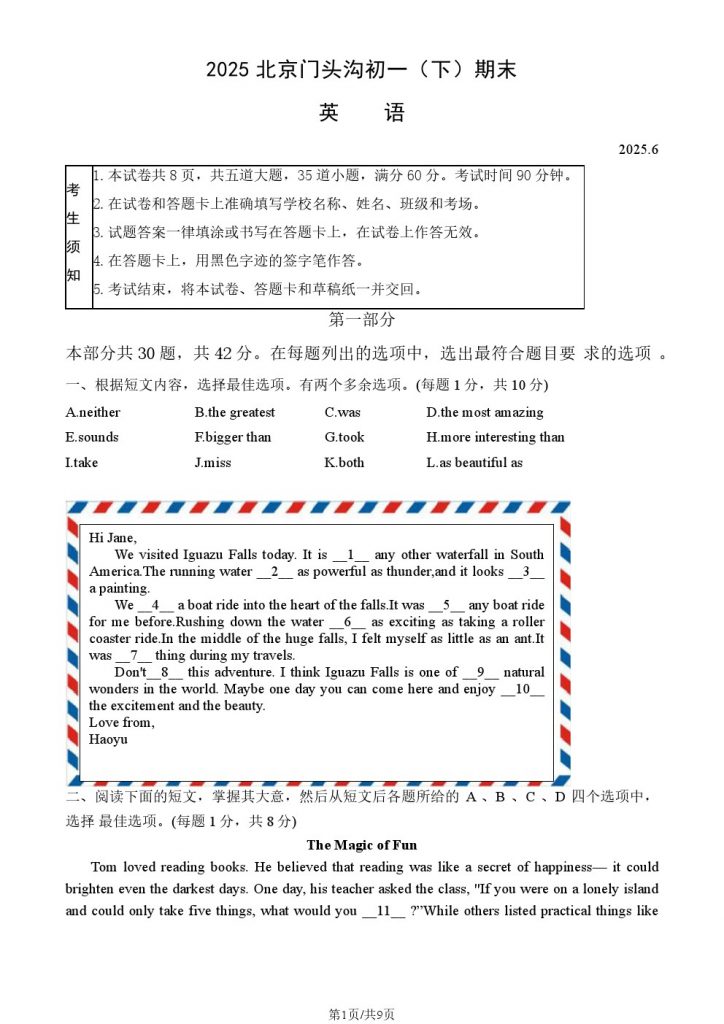 2025年北京各区初一(下)期末考已陆续开始进行,北达教研组整理了2025北京门头沟初一(下)期末英语试题及答案,分享给大家。