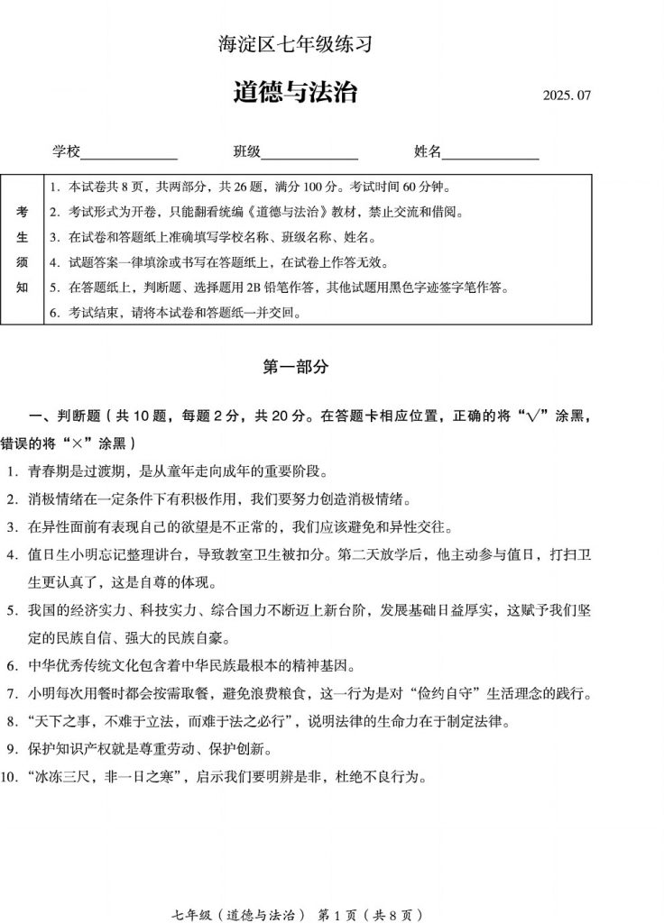 2025年北京各区初一(下)期末考已陆续开始进行,北达教研组整理了2025北京海淀初一(下)期末道法试题,分享给大家。