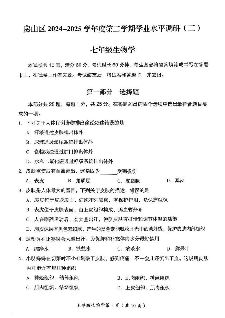 2025年北京各区初一(下)期末考已陆续开始进行,北达教研组整理了2025北京房山初一(下)期末生物试题,分享给大家。