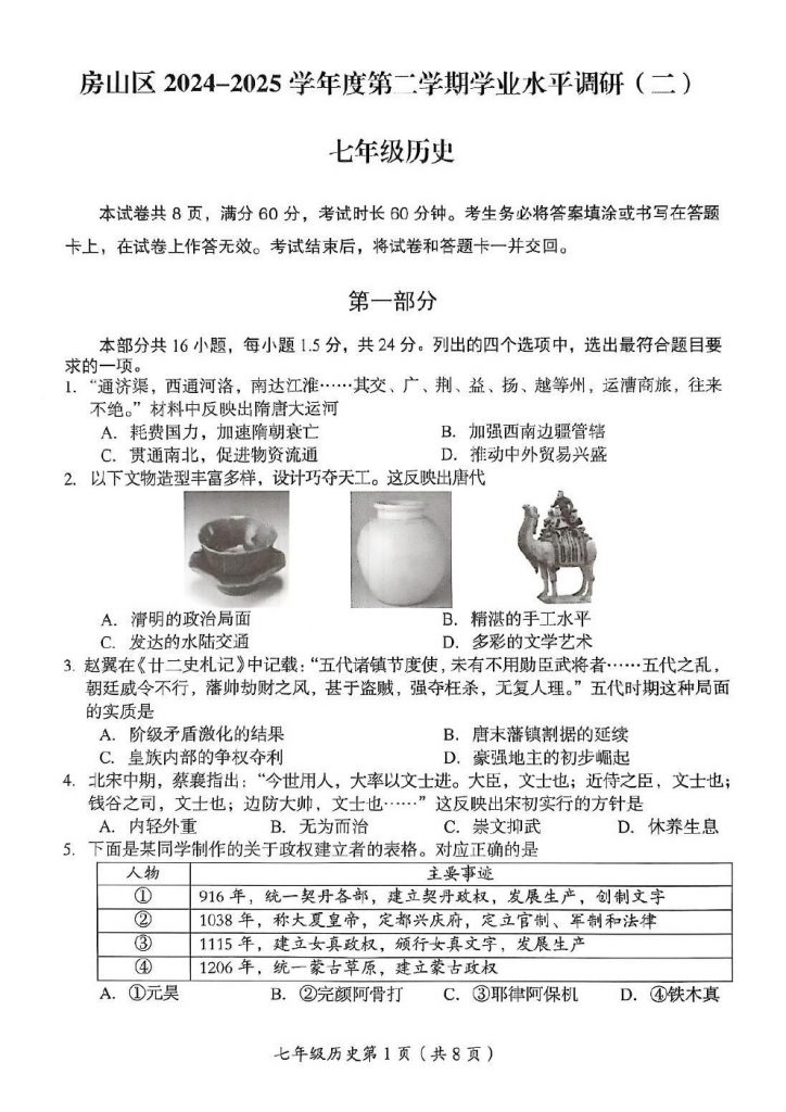 2025年北京各区初一(下)期末考已陆续开始进行,北达教研组整理了2025北京房山初一(下)期末历史试题,分享给大家。