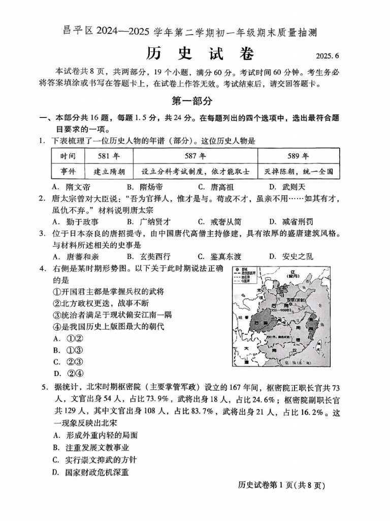 2025年北京各区初一(下)期末考已陆续开始进行,北达教研组整理了2025北京昌平初一(下)期末历史试题,分享给大家。