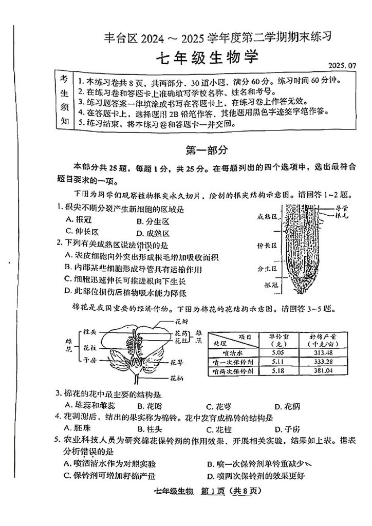 2025年北京各区初一(下)期末考已陆续开始进行,北达教研组整理了2025北京丰台区初一(下)期末生物试题,分享给大家。
