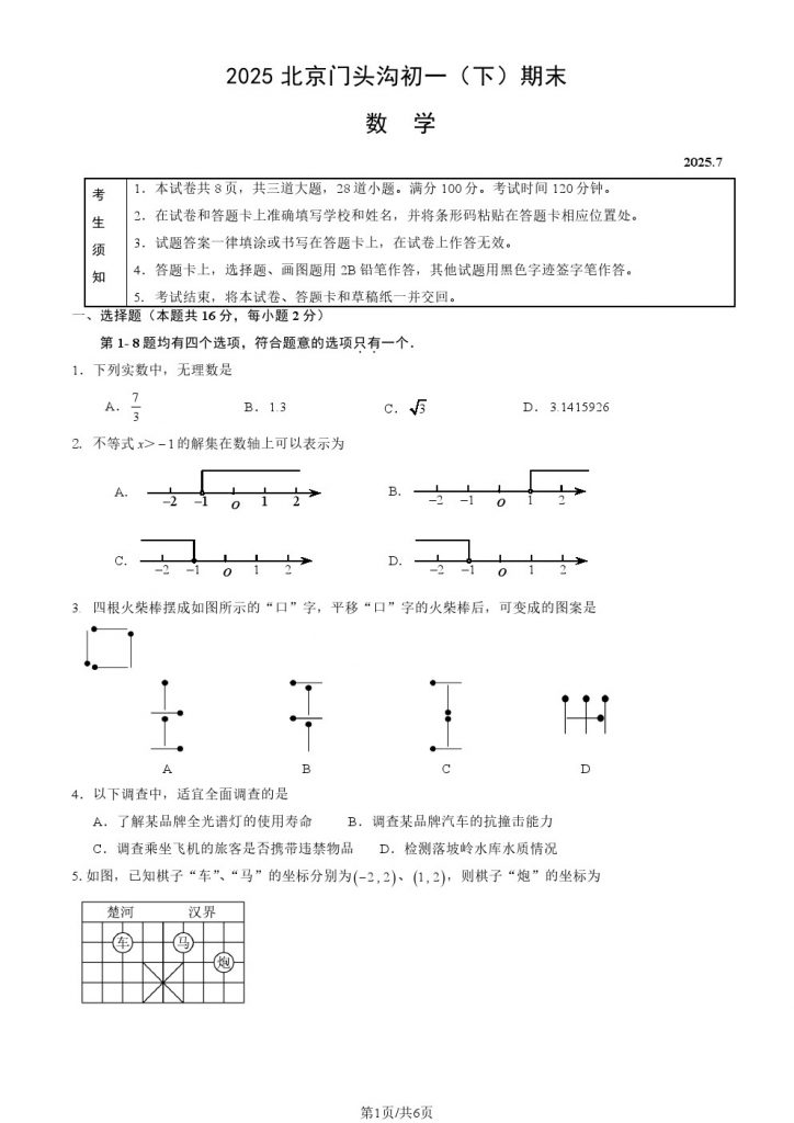 2025年北京各区初一(下)期末考已陆续开始进行,北达教研组整理了2025北京门头沟初一(下)期末数学试题,分享给大家。
