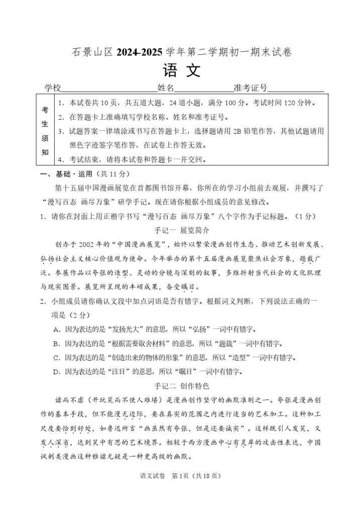 2025年北京各区初一(下)期末考已陆续开始进行,北达教研组整理了2025北京石景山初一(下)期末语文试题及答案,分享给大家。
