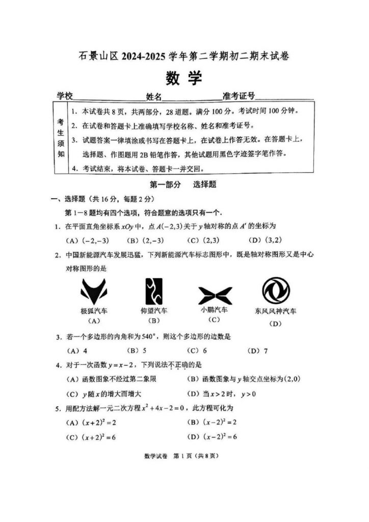 2025年北京各区初二(下)期末考已陆续开始进行,北达教研组整理了2025北京石景山初二(下)期末数学试题,分享给大家。