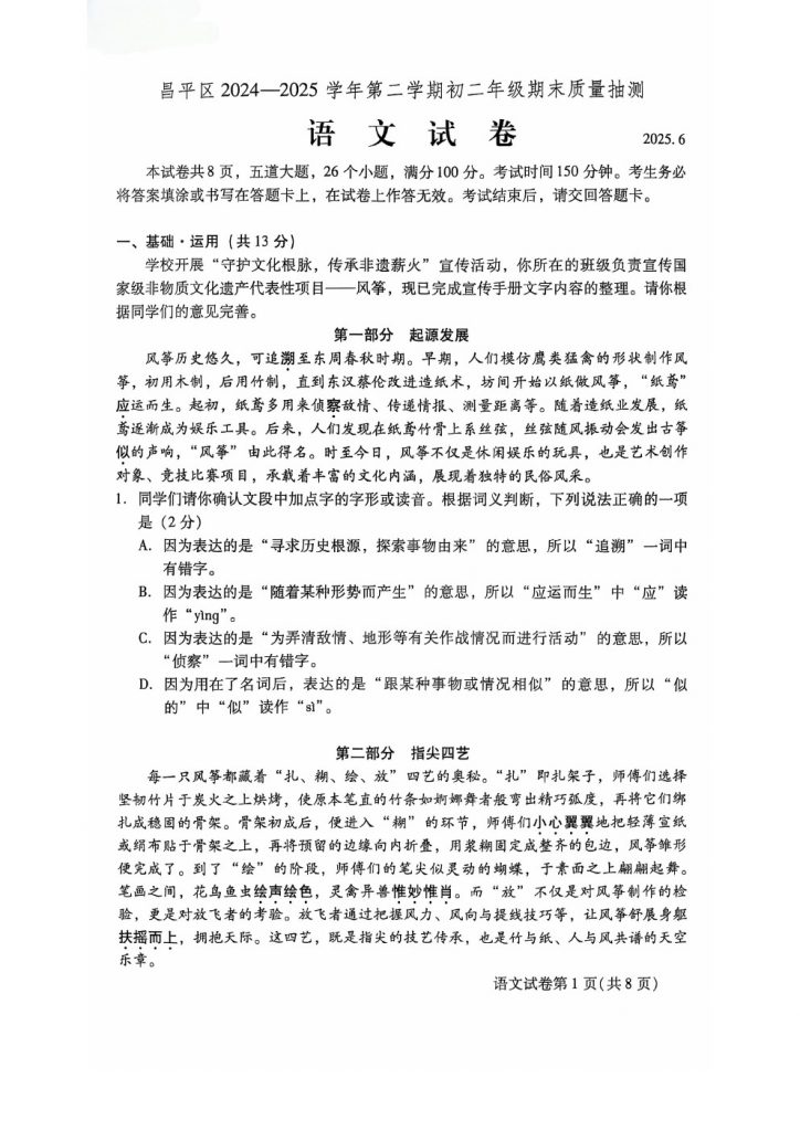 2025年北京各区初二(下)期末考已陆续开始进行,北达教研组整理了2025北京昌平初二(下)期末语文试题及答案,分享给大家。