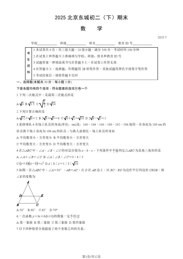 2025年北京各区初二(下)期末考已陆续开始进行,北达教研组整理了2025北京东城初二(下)期末数学试题及答案,分享给大家。