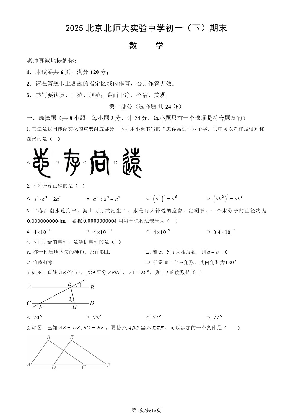 2025年北京各区初一(下)期末考已陆续开始进行,北达教研组整理了2025北京北师大实验中学初一(下)期末数学试题及答案,分享给大家。