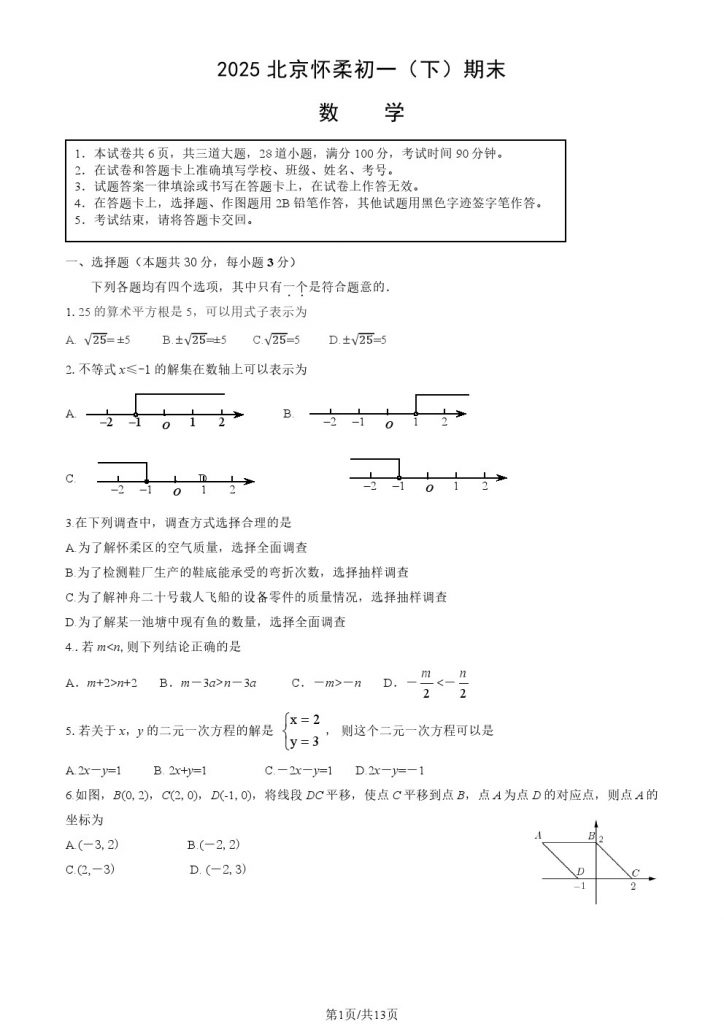 2025年北京各区初一(下)期末考已陆续开始进行,北达教研组整理了2025北京怀柔初一(下)期末数学试题及答案,分享给大家。