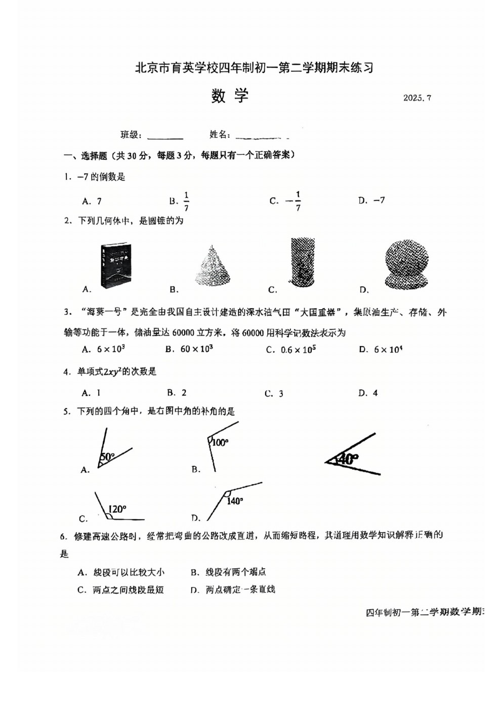 2025年北京各区初一(下)期末考已陆续开始进行,北达教研组整理了2025北京育英学校初一(下)期末数学(四年制)试题,分享给大家。