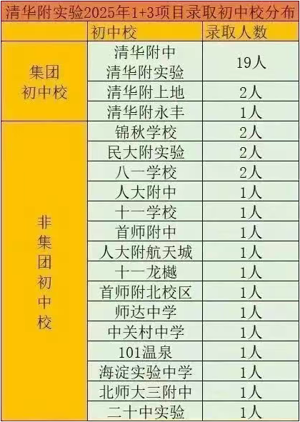 2025年海淀区1+3项目录取全部结束,下面是网传清华附实验2025年1+3项目录取学校分布情况。