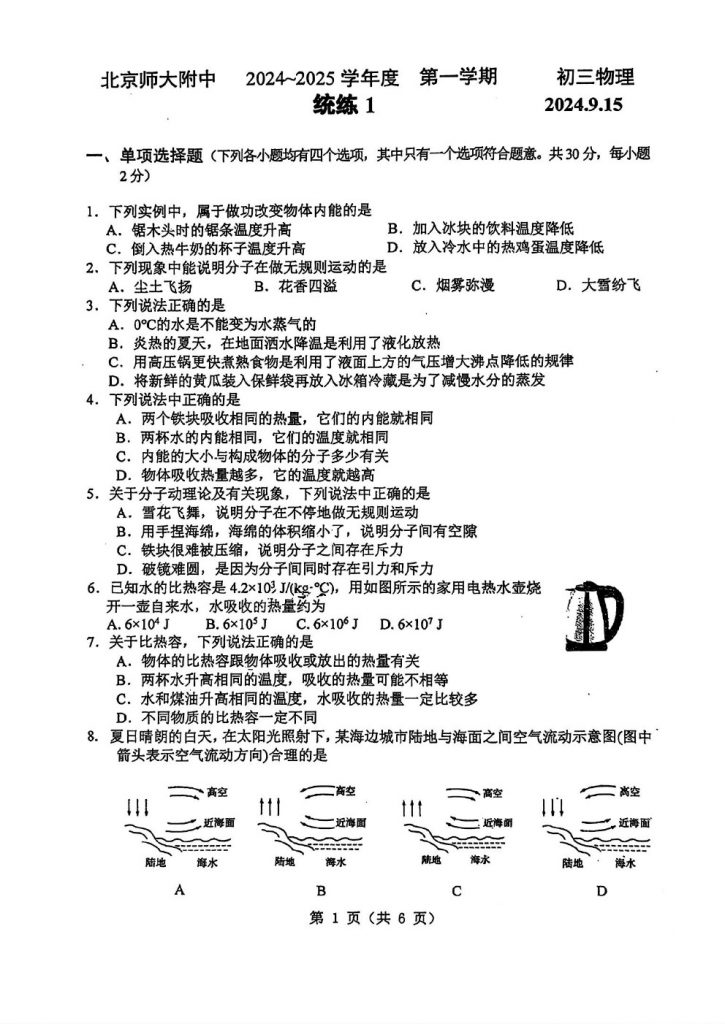 北达教研组整理了2024北京北师大附中初三(上)开学考物理试题,分享给大家,同学们做题练习后可结合参考答案进行估分。