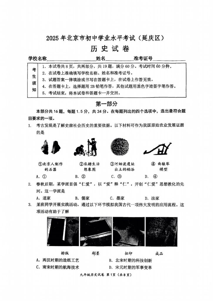 2025北京延庆区初中学业水平考试历史试题及答案