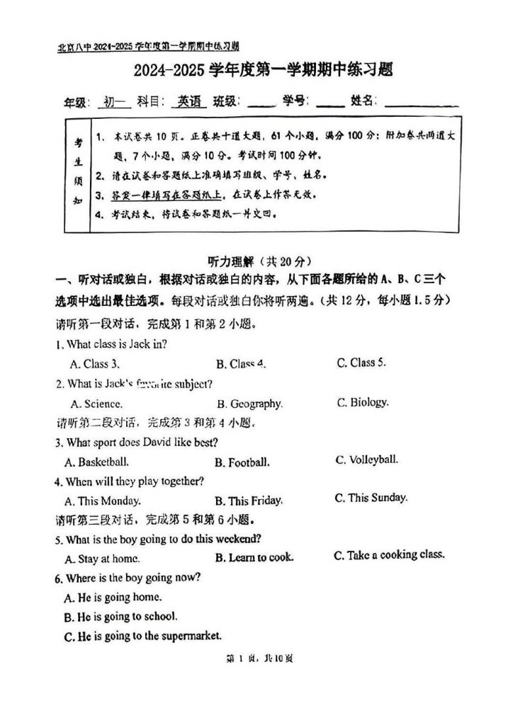 为方便大家对答案、下载练习等小编整理了2024北京八中初一(上)期中英语试题及答案,需要的小伙伴赶紧下载练习起来吧: