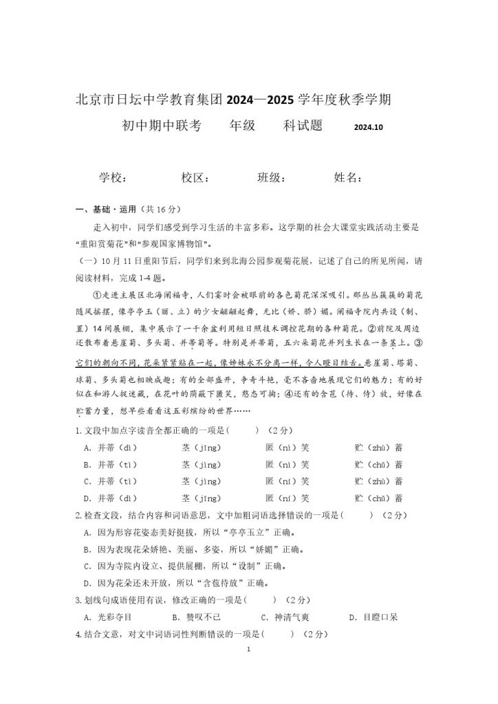 为方便大家对答案、下载练习等小编整理了2024北京日坛中学初一(上)期中语文试题及答案,需要的小伙伴赶紧下载练习起来吧:
