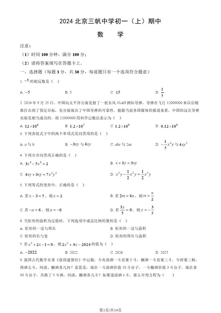 为方便大家对答案、下载练习等小编整理了2024三帆中学初一(上)期中数学试题及答案,需要的小伙伴赶紧下载练习起来吧: