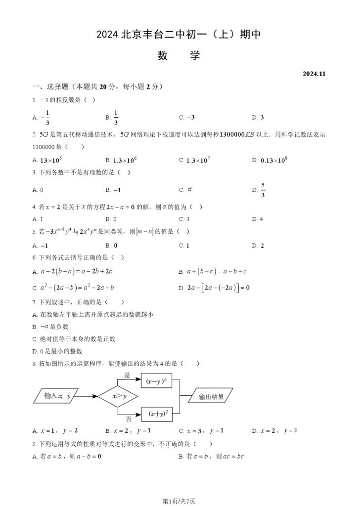 为方便大家对答案、下载练习等小编整理了2024北京丰台二中初一(上)期中数学试题及答案,需要的小伙伴赶紧下载练习起来吧: