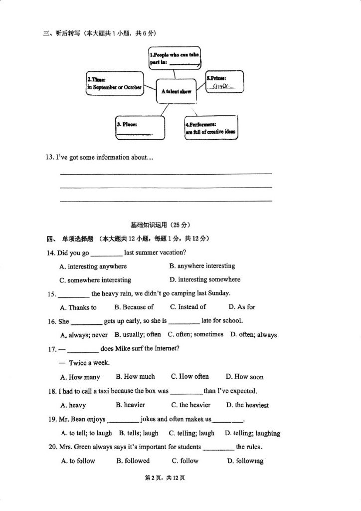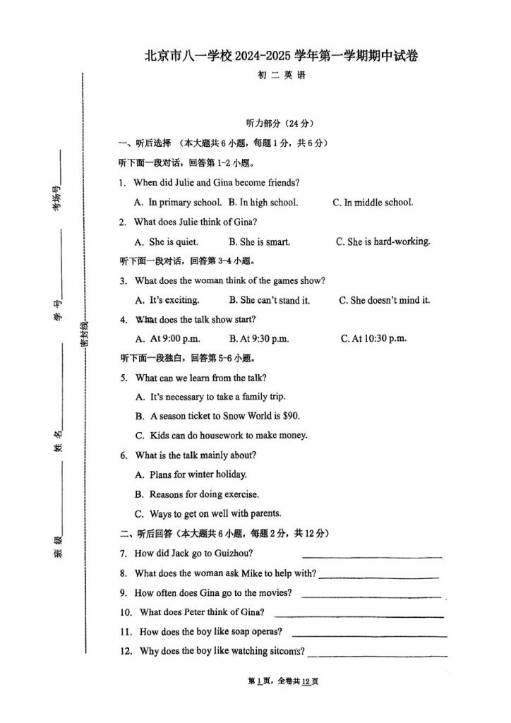 为方便大家对答案、下载练习等小编给大家搜集了2024北京八一学校初二(上)期中英语试题及答案,需要的小伙伴赶紧下载练习起来吧: